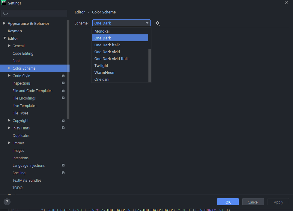 설치를 하셨다면 이제 Edior > Color Scheme 에서 One Dark를 클릭하시면 됩니다.