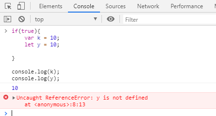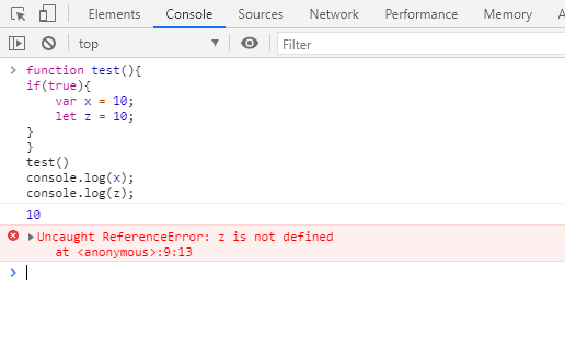 이것도 역시 var는 정상적으로 출력이 되지만 let은 출력이 되질 않습니다.