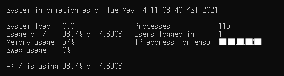 서버에 접속을 했는데 저장공간이 처음 94% 가까이 되었습니다.
